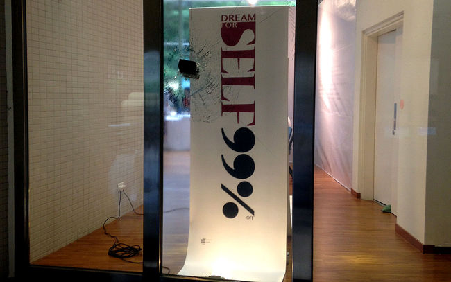The installation work on the window glass presents a dilemma about living issues. The installation's visual impact prompts the audience to reflect on the values of life.